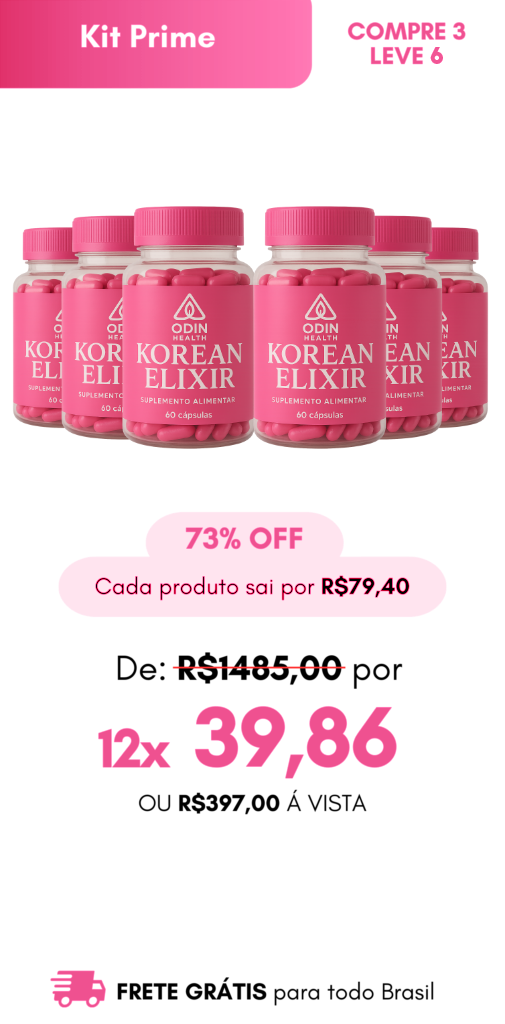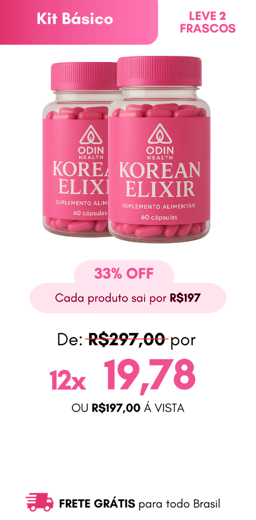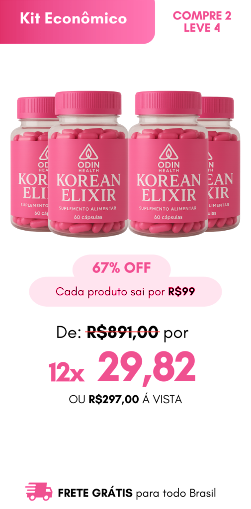 O Korean Elixir é uma fórmula inovadora, com ingredientes de origem natural, desenvolvida para reativar o poder de rejuvenescimento da sua pele. Ele age estimulando a renovação celular, o processo fundamental para combater os sinais do envelhecimento, como rugas e flacidez. O resultado é uma pele visivelmente mais jovem, firme e radiante, resgatando sua autoestima e a vitalidade que você merece. Seus componentes são da mais alta qualidade e possuem eficácia estudada pela ciência.