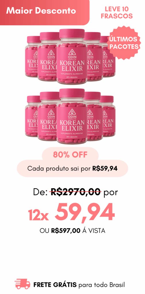 O pacote mais vendido do Korean Elixir é o nosso tratamento completo de 10 frascos (para 10 meses), pois os resultados na pele são cumulativos. Para que a renovação celular seja reativada de forma eficaz e contínua, o uso prolongado é fundamental. Além de ser o kit com maior desconto, recomendamos ele porque é o período de tempo ideal onde os estudos com nossos compostos apontaram o auge na produção de colágeno e uma melhora visível na firmeza e na redução de linhas de expressão.